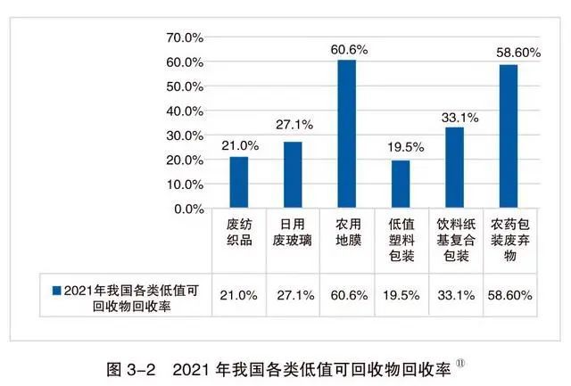 2021年,我國各類低值可回收物總的回收量約為2547萬噸,回收率約為26.6%。其中,廢舊農(nóng)用地膜回收率達(dá)到60.6%,農(nóng)藥包裝廢棄物、飲料紙基復(fù)合包裝、日用廢 玻璃、廢舊紡織品、低值塑料包裝的回收率依次為58.6%、33.1%、27.1%、21%和19.5%,總體回收利用率低。