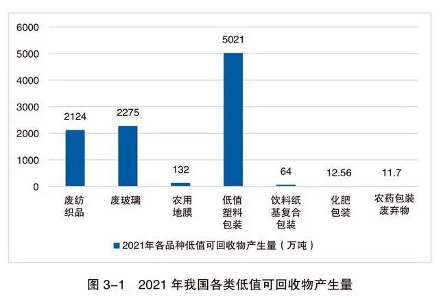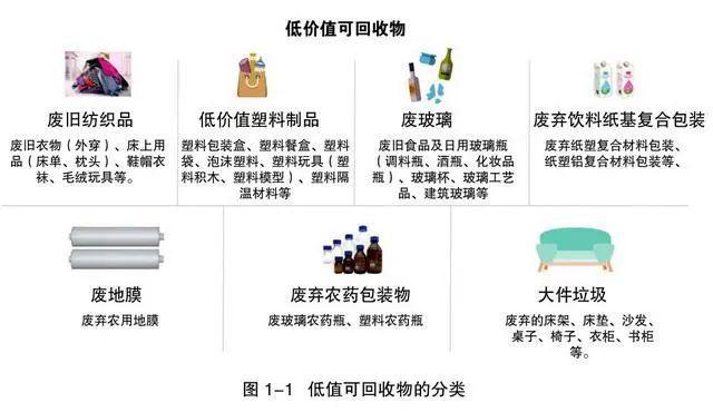 根據(jù)報(bào)告,低值可回收物是一個(gè)與報(bào)廢汽車、廢家電等高價(jià)值廢棄物相對(duì)的概念,主要是指在生產(chǎn)生活中產(chǎn)生的具有一定回收利用價(jià)值,能夠通過一定技術(shù)經(jīng)濟(jì)手段實(shí)現(xiàn)材料化回收利用并獲得一定經(jīng)濟(jì)效益的各類廢棄物,但由于對(duì)其回收利用的經(jīng)濟(jì)效益較差,單純依靠經(jīng)營主體自發(fā)行為難以實(shí)現(xiàn)高比例回收利用,如廢玻璃、廢舊紡織品、飲料紙基復(fù)合包裝、低值塑料包裝、化肥農(nóng)藥包裝、地膜等。